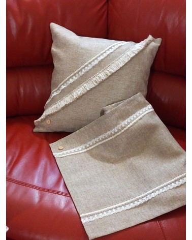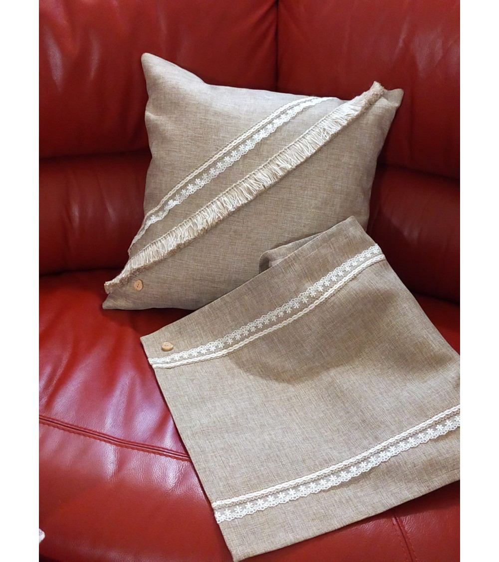 Cuscino in lino fornito di zip e abbellito di passamaneria in pizzo